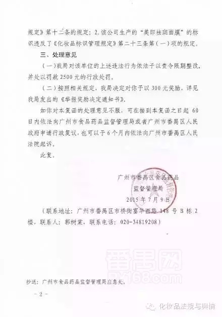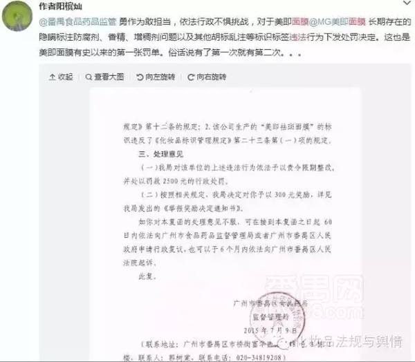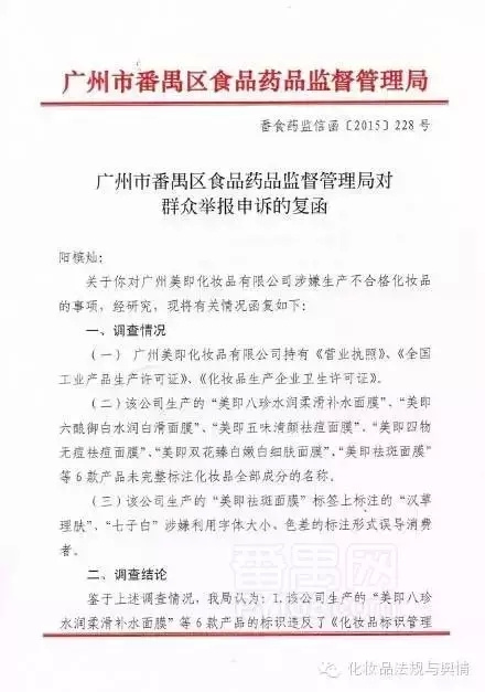 近期,經(jīng)消費者舉報,番禺區(qū)藥監(jiān)局對美即面膜未全成分標(biāo)注、標(biāo)識標(biāo)簽誤導(dǎo)消費者等違法行為下發(fā)處罰決定。廣州美即化妝品有限公司被處責(zé)令限期整改,并被處以罰款2500元。